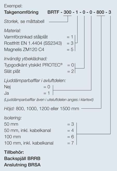BRTF är en takgenomföring med två kanalanslutningar, avluft och uteluft, avsedd att användas tillsammans med våra kombihuvar.
