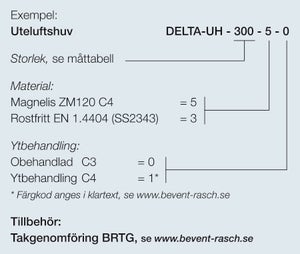 DELTA-UH är en uteluftshuv för användning i komfort- och industrianläggningar. Storlek 200, 400, 500, 600, 800 & 1000-2000 tillverkas i Magnelis. OBS! Ej längre tillgänglig i Aluzink.